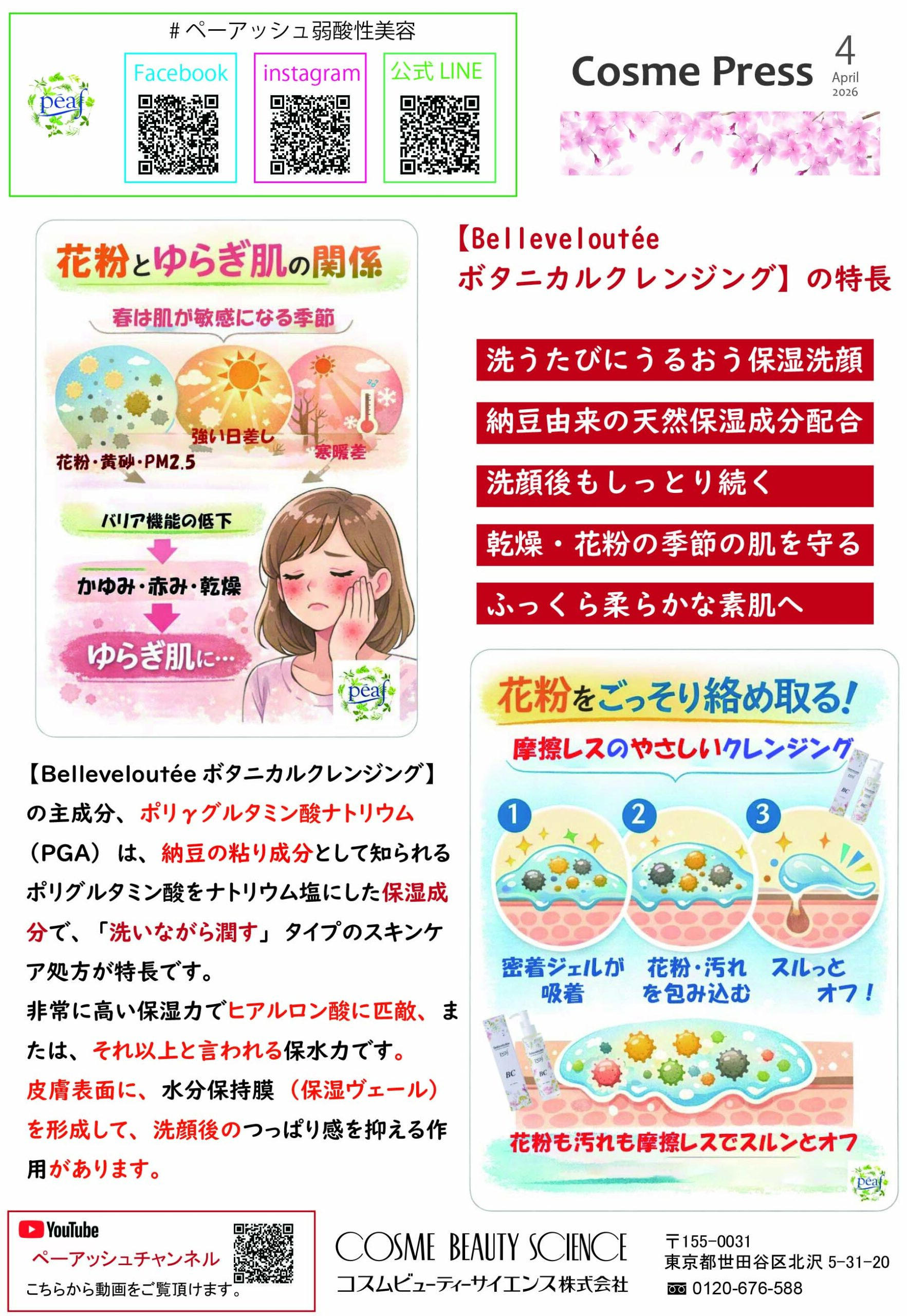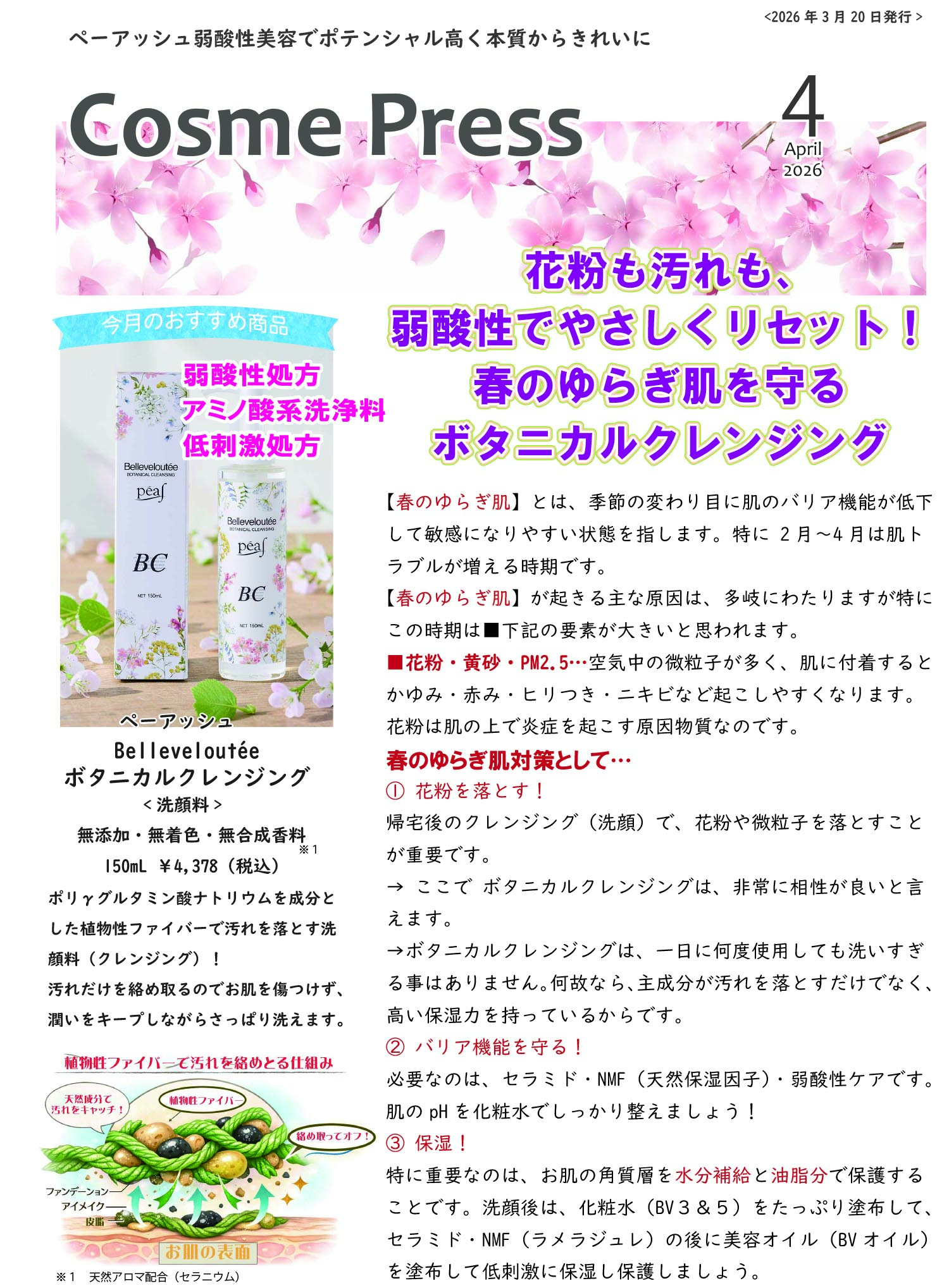 コスムプレス 令和8年4月号 【花粉も汚れも、 弱酸性でやさしくリセット! 春のゆらぎ肌を守る ボタニカルクレンジング】