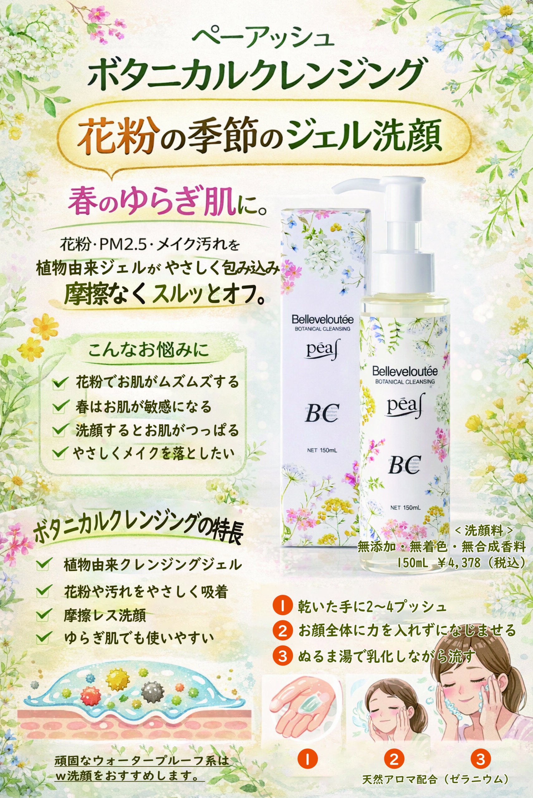 弱酸性のpHで、摩擦レスで物理的にお肌を傷つけない+お肌の残留物ゼロのスペックで